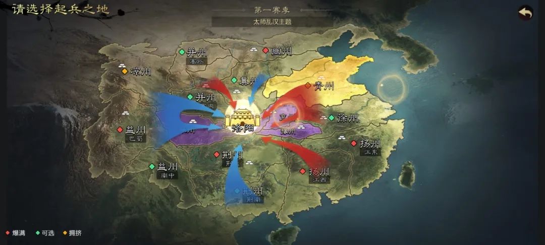 倘若一开始想为胜利做铺垫,而且热衷于上阵杀敌,推荐益凉两州,因为猥琐发育的同时可以争取进军资源州(即兖州,司隶,豫州。拥有高级土地且决定游戏胜负——占领洛阳)。