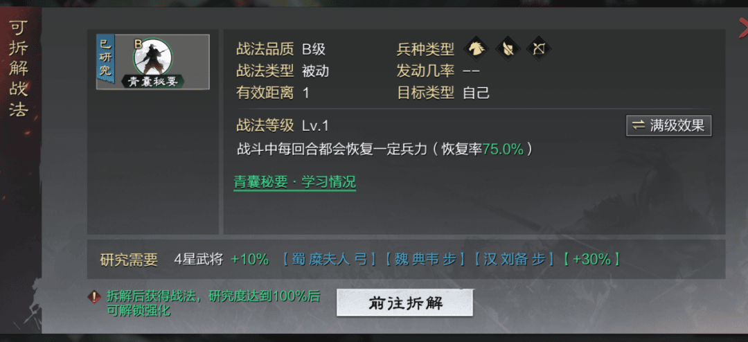 每个三星及以上武将都能拆解战法,虽然是即拆即用,需要花费武将卡研究后,才能用招募武将时给予玩家的战法经验升级,发挥出真正的威力。