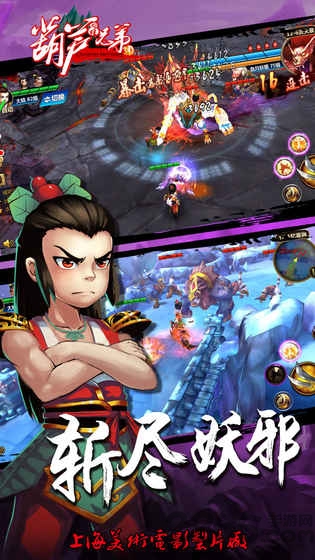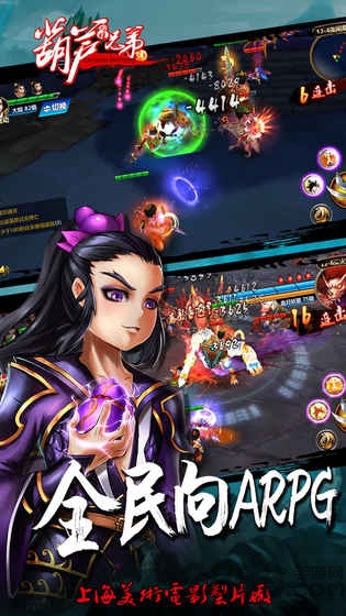 2、战斗可同时出战三个葫芦娃,通过不同角色和装备搭配,在战斗中将动作性和策略性巧妙融合;实时在线PVP系统更是把玩家之间的合作、对抗表现得淋漓尽致;