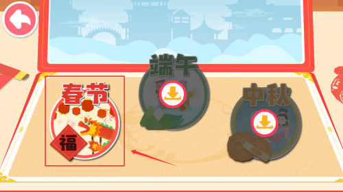2、选择红框标注的春节主题,通过福字烟花了解节日习俗。