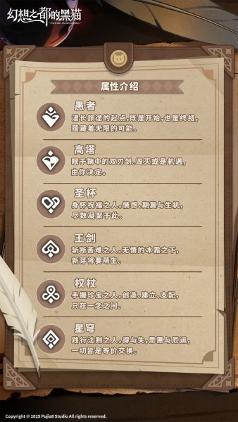 六种属性:愚者、高塔、圣杯、王剑、权杖、星穹。
