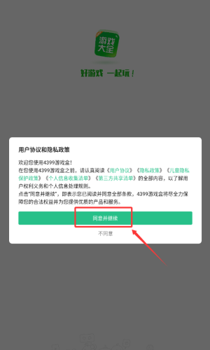 1、阅读用户协议后,点击红框标注的绿色同意并继续按钮。