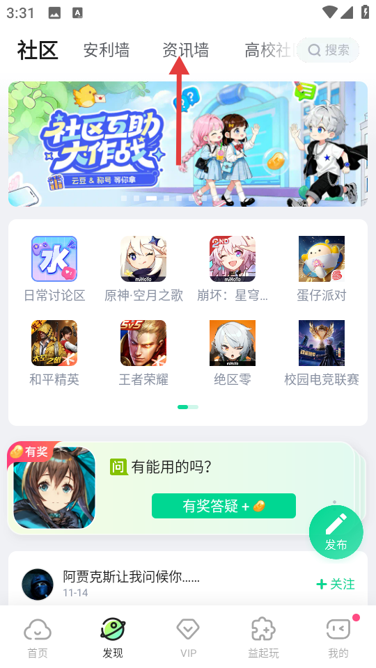 1、首页点击发现进入社区。