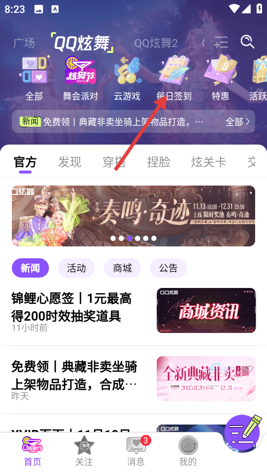 2、然后进入首页可以看到QQ炫舞的最新活动、新品以及版本修改信息等;