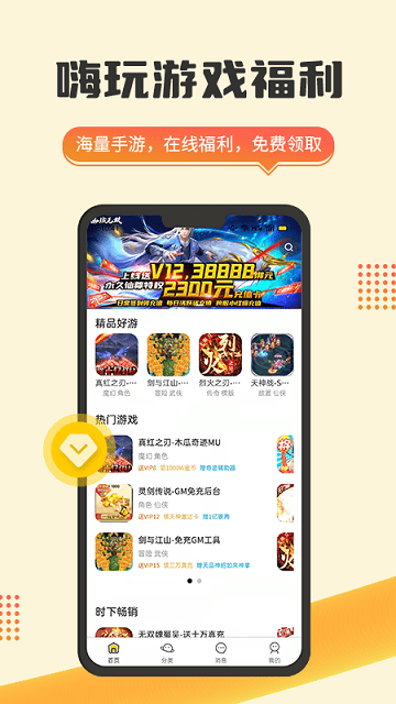 嗨玩游戏福利手游是一款汇聚了超多BT版福利手游的游戏盒子。在这里,系统会自动为你推荐各种热门的游戏,玩家也可以随时查找你想要玩的游戏内容,各式各样的游戏心得和游戏攻略,海量的游戏礼包,为你开出许多的游戏奖励,心动了的小伙伴们还在等什么?就快来下载使用吧!