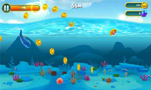 海豚大冒险(Dolphy Dash)是操作简单,玩法有趣的休闲类游戏。游戏内你可以扮演可爱的小海豚在海里遨游。游戏操作非常简单,非常考验玩家的反应能力,玩家用手控制海豚在凶险的海洋里穿梭,翻腾跳跃来拾取金币!不过这过程中可要时刻当心哦!不要撞到那些会让你受伤的东西。