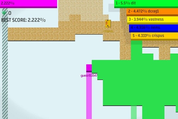 风格独特的io类休闲竞技游戏,游戏采用极简化的风格设计、画风十分独特!玩家们将操纵一张纸片在一张地图内展开疯狂的圈地行为,谁能在有效的时间内,占领最多的地盘,谁就会成为这场大乱斗的胜利者!需要注意的是,纸片的末端是致命弱点哟,触者即死,请务必保护好纸片的末端!
