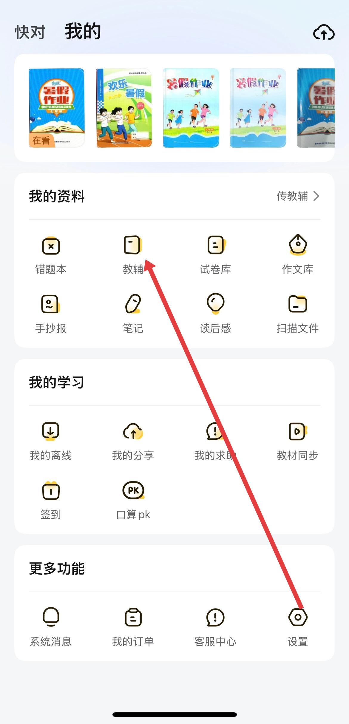 1、进入快对app后,打开我的页面,找到我的资料区域中的教辅,点击进入。