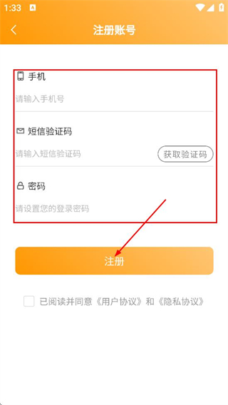 4、在注册账号页面,填写手机号、验证码、密码,点击注册,完成账号注册。