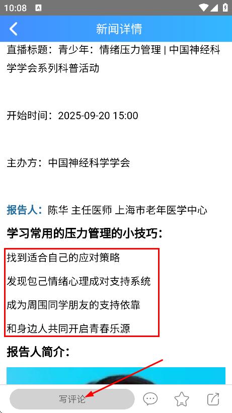 4、进入讲座详情页后,可查看讲座内容,还能点击写评论发表评论。