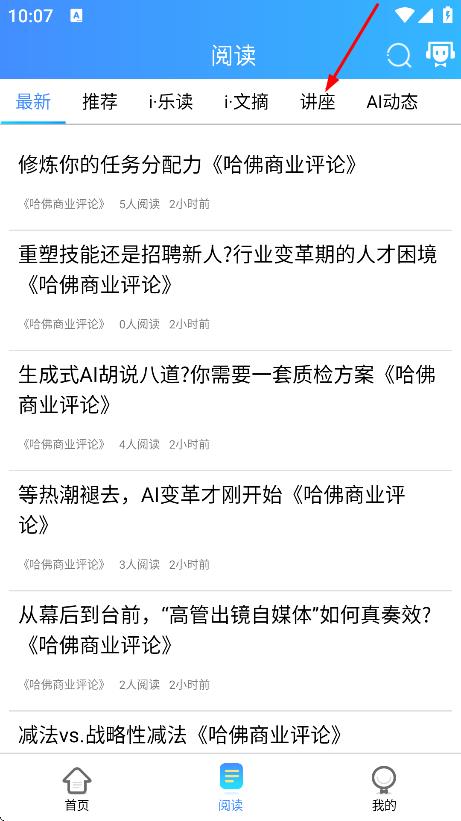 2、在阅读页面,点击讲座标签,查看讲座相关内容。