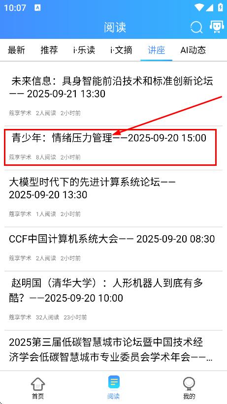 3、在讲座列表中,选择感兴趣的讲座,如青少年情绪压力管理。
