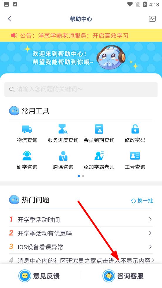 3、进入帮助中心页面后,浏览页面至底部,点击咨询客服按钮,即可进入与洋葱学园客服沟通的界面。