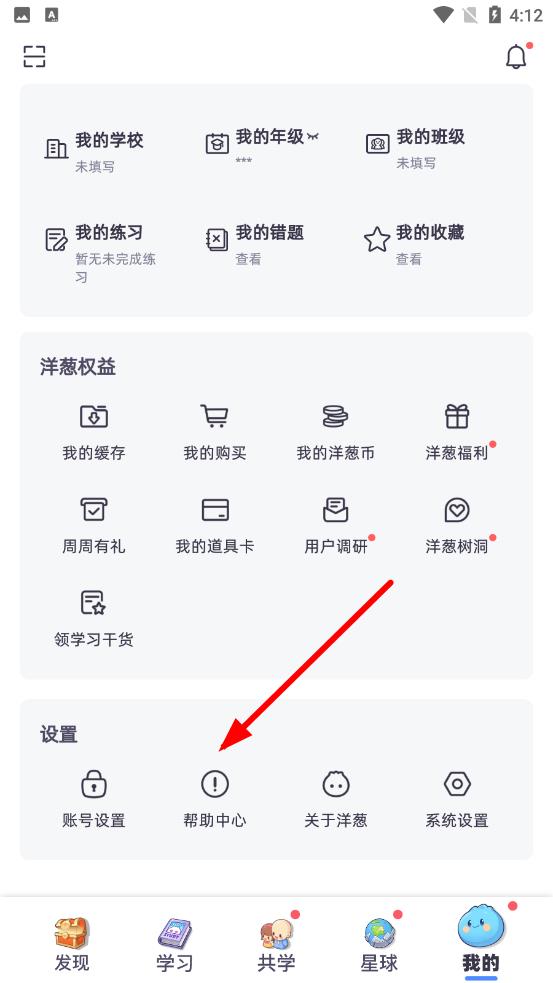 2、在我的界面中,向下滑动屏幕,在设置板块找到帮助中心选项并点击。