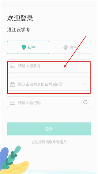 2、在登录页面,填写请输入报名号对应的内容,身份证号后6位对应的密码。