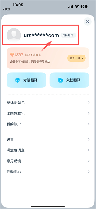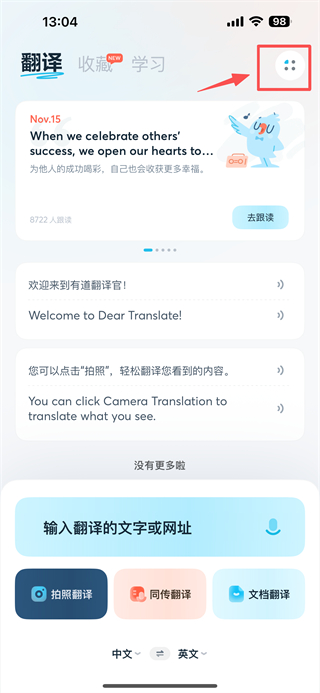 1、打开翻译类APP,点击右上角四点菜单按钮,进入个人功能页面。