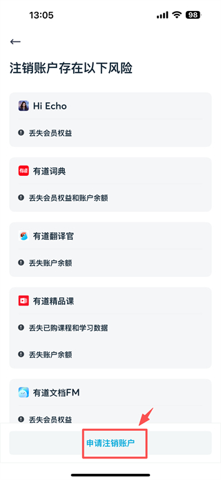 4、在注销风险提示页面,点击申请注销账户按钮,完成账号注销操作。