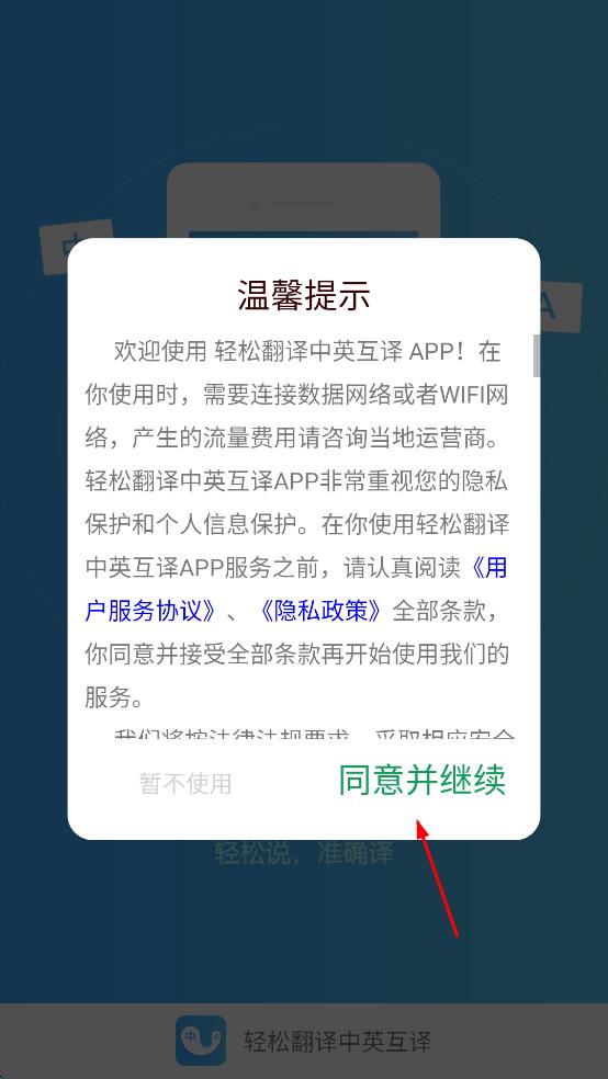 1、打开轻松翻译中英互译APP,进入温馨提示界面,界面说明使用需连接网络等,点击“同意并继续”按钮。