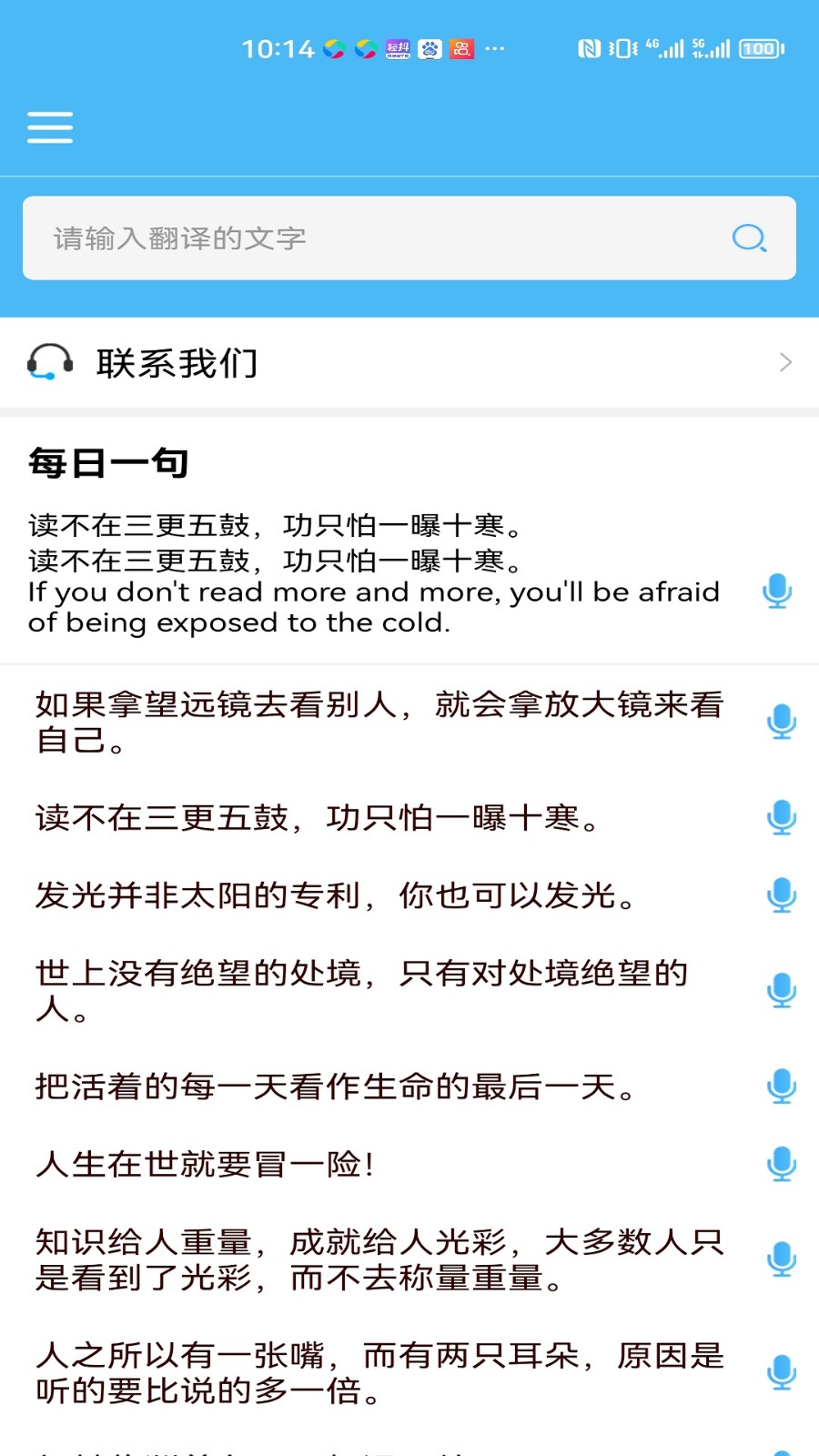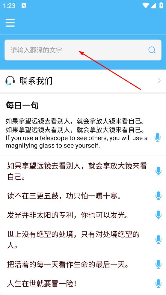 2、进入APP主界面,界面有搜索栏,还有“联系我们”“每日一句”等板块,点击搜索栏,准备输入要翻译的文字。