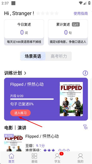 1、在首页的训练计划区域,点击进入练习按钮,进入练习页面。