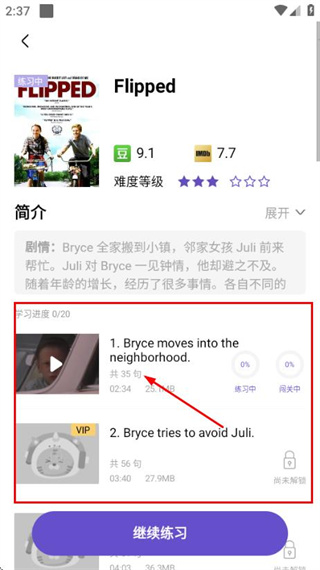 2、在练习页面中,点击句子条目,进入该片段的朗读练习界面。