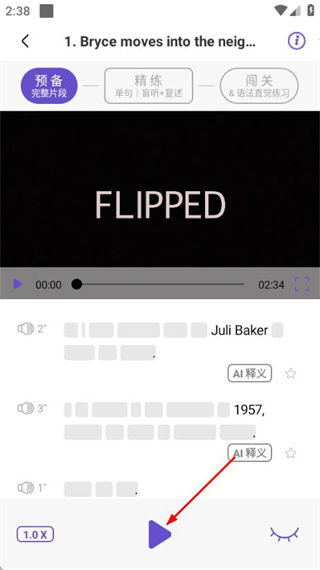 3、在朗读练习界面,点击播放按钮,开始该片段的英语听力与复述练习。