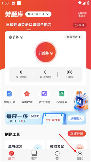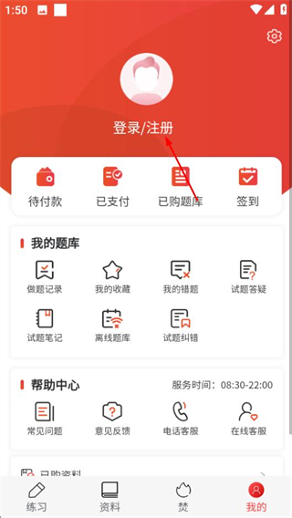 1、在焚题库首页,点击底部我的选项,进入个人中心页面。