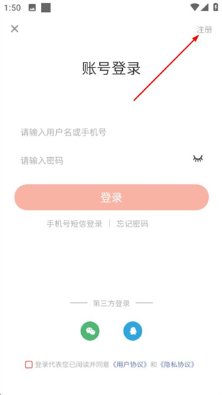 3、在账号登录页面,点击右上角注册选项,进入注册页面。