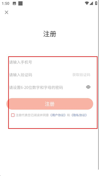 4、在注册页面,填写信息并勾选协议后点击注册按钮,完成账号注册。