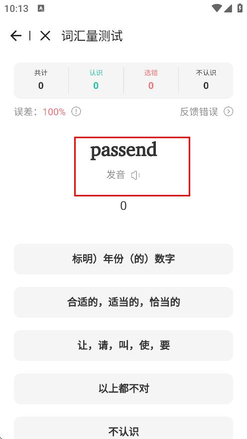 4、进入测试后,根据显示的单词,选择对应的释义选项。