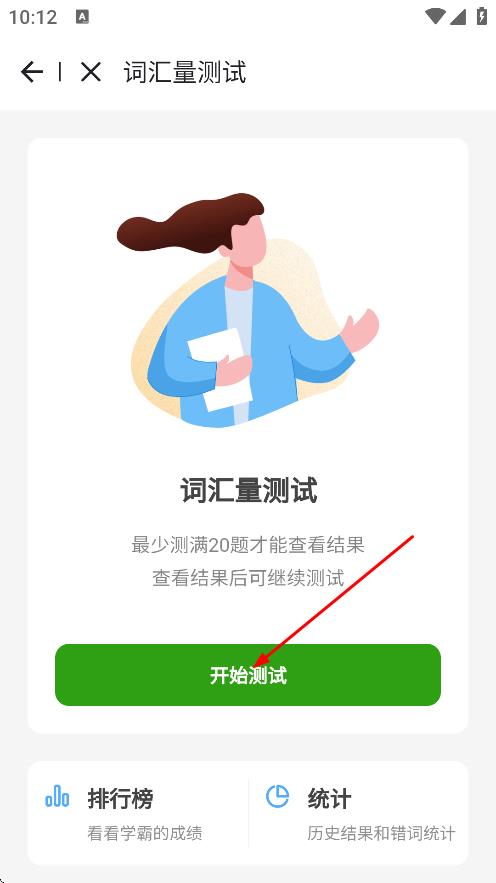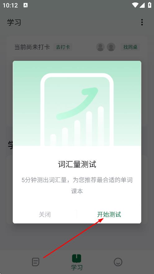2、在词汇量测试弹窗中,点击开始测试,进入词汇量测试页面。