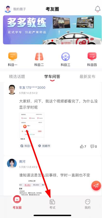 1、打开多多驾到App,点击底部导航栏中的考试选项。