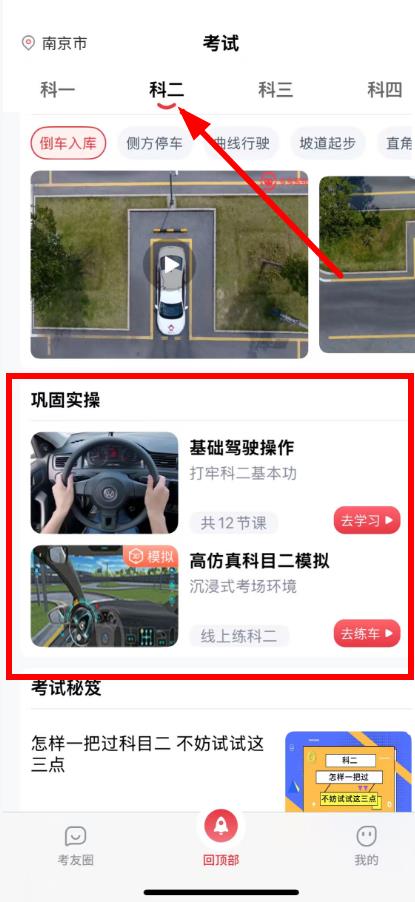 2、在考试页面,点击上方科二栏目,下滑找到巩固实操板块。
