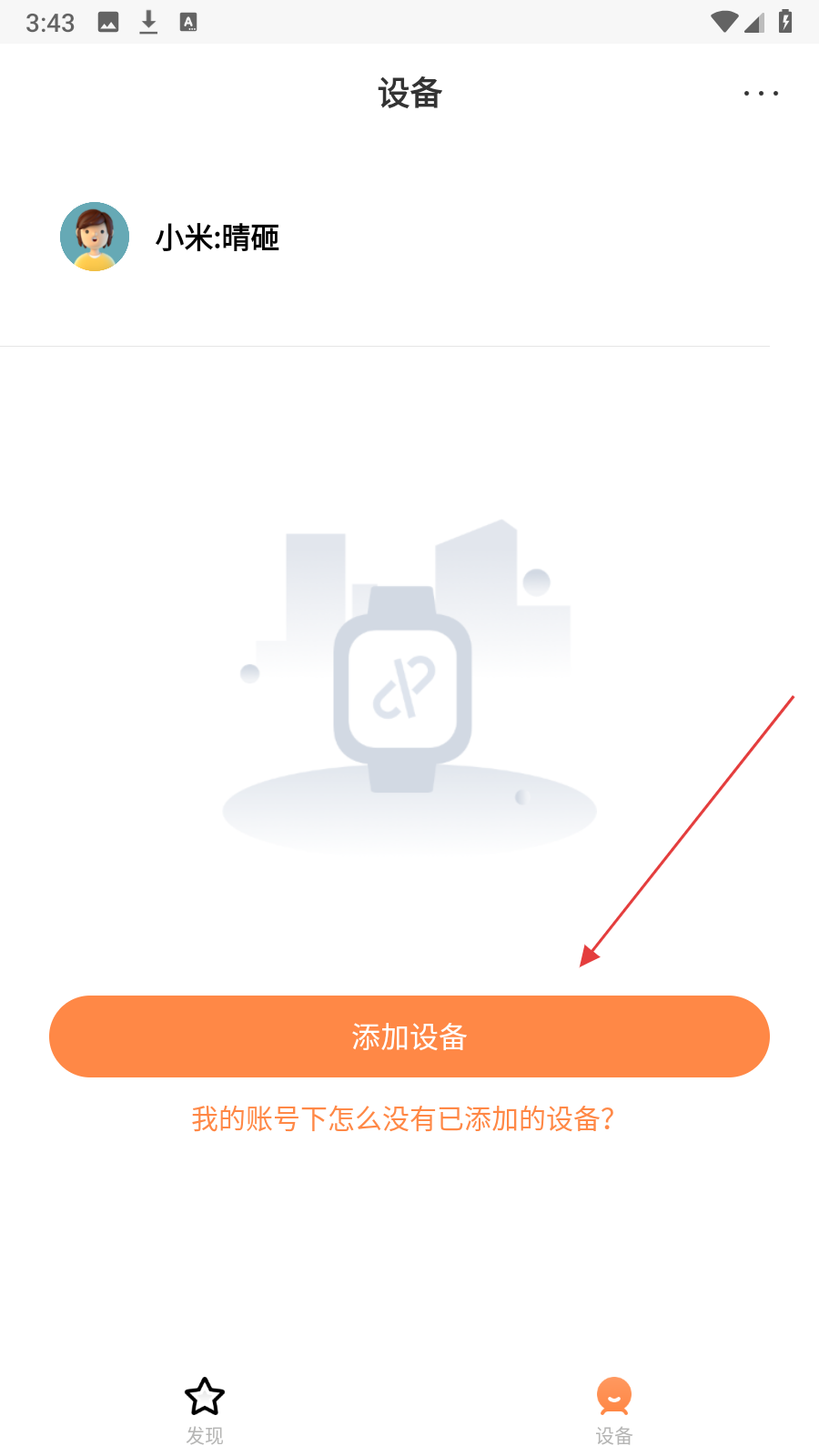 1、打开米兔应用,进入设备页面,点击页面中间显眼的橙色添加设备按钮,进入添加设备的具体操作界面。