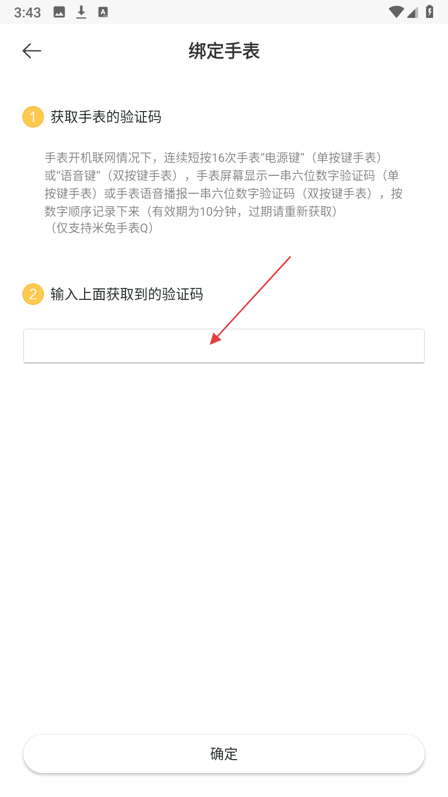 3、进入手动验证码绑定界面,按照提示获取验证码,然后输入到绑定手表页面的输入框中,点击确定按钮完成设备绑定。