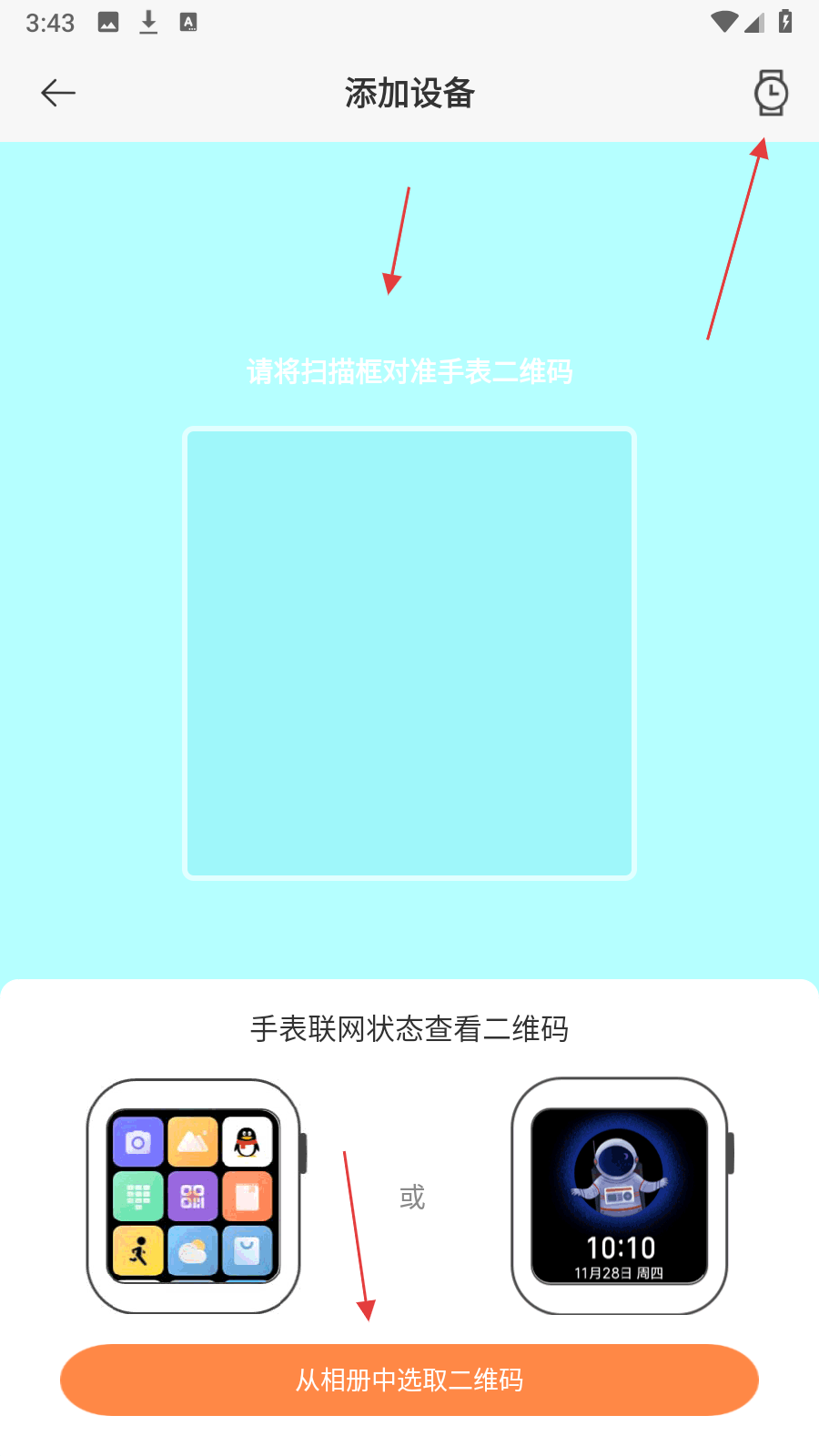 2、选择扫码绑定方式,将手机的扫描框对准手表屏幕上显示的二维码,或者点击从相册中选取二维码选项,或者点击右上角。