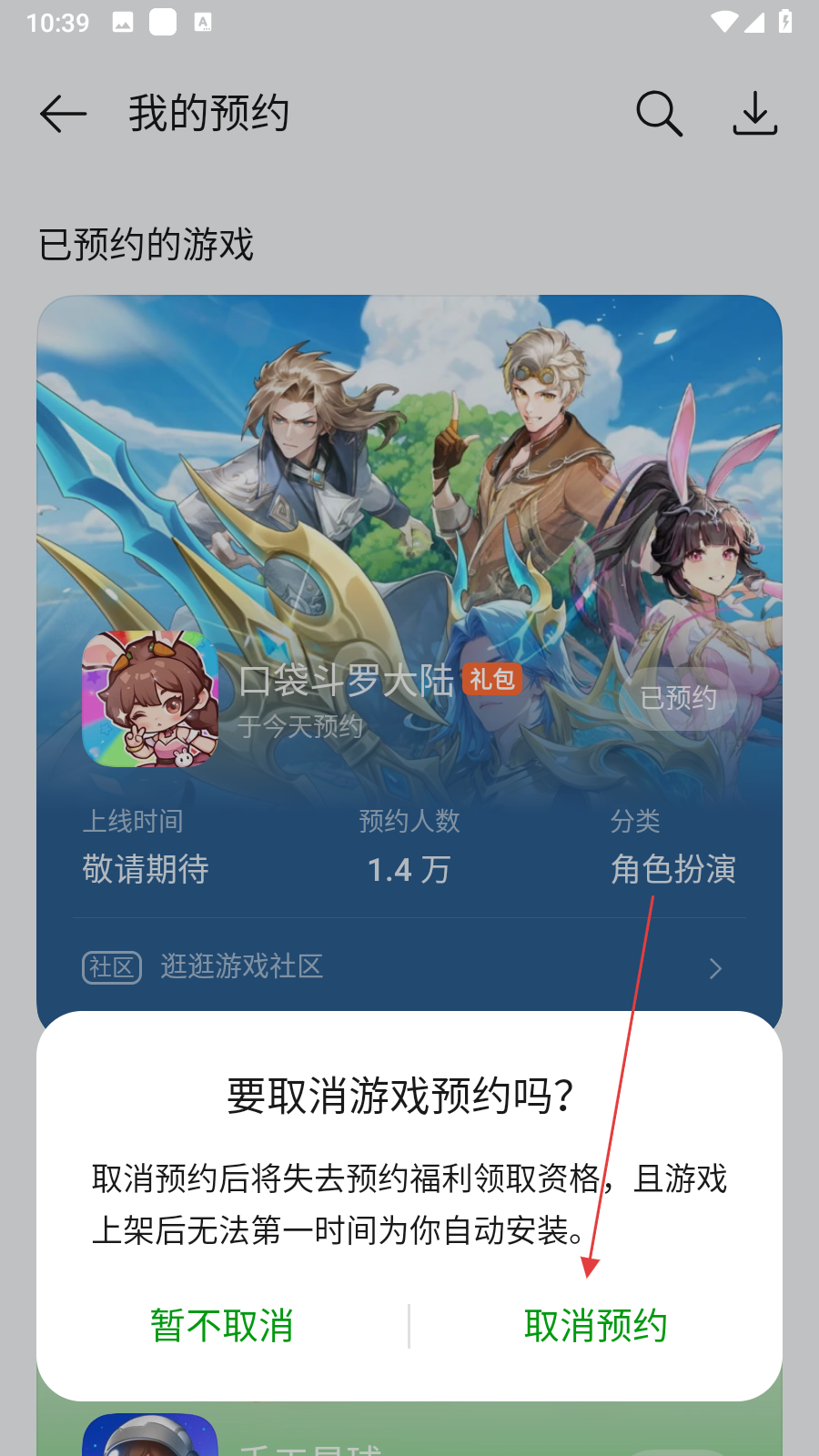 3、在我的预约页面,找到想要取消预约的游戏,点击该游戏,在弹出的确认提示框中,点击取消预约按钮,即可成功取消对该游戏的预约。