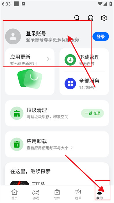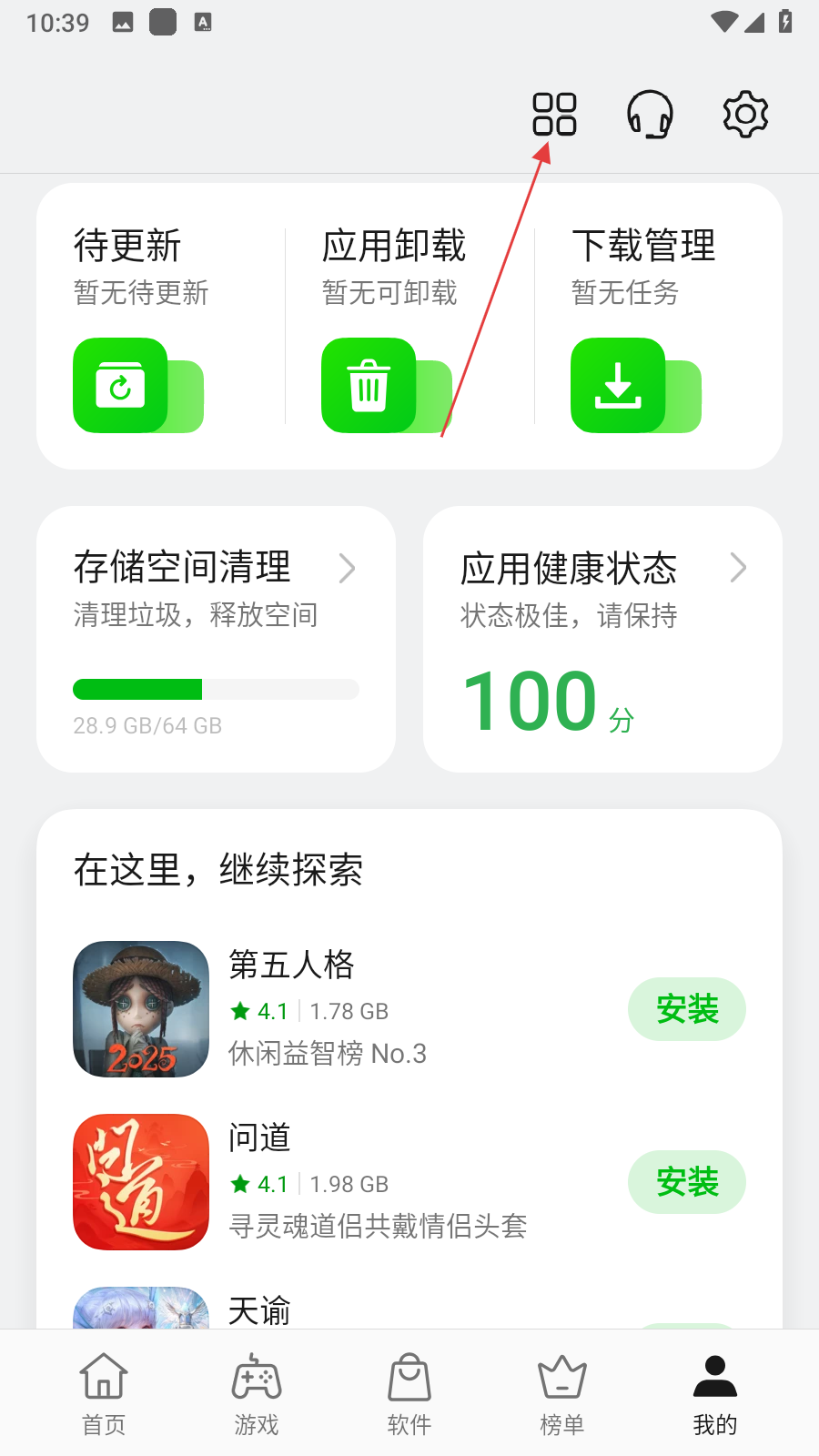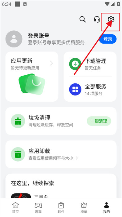 1、打开OPPO软件商店进入首页,点击右上角九宫格形状的全部服务图标,进入全部服务页面。