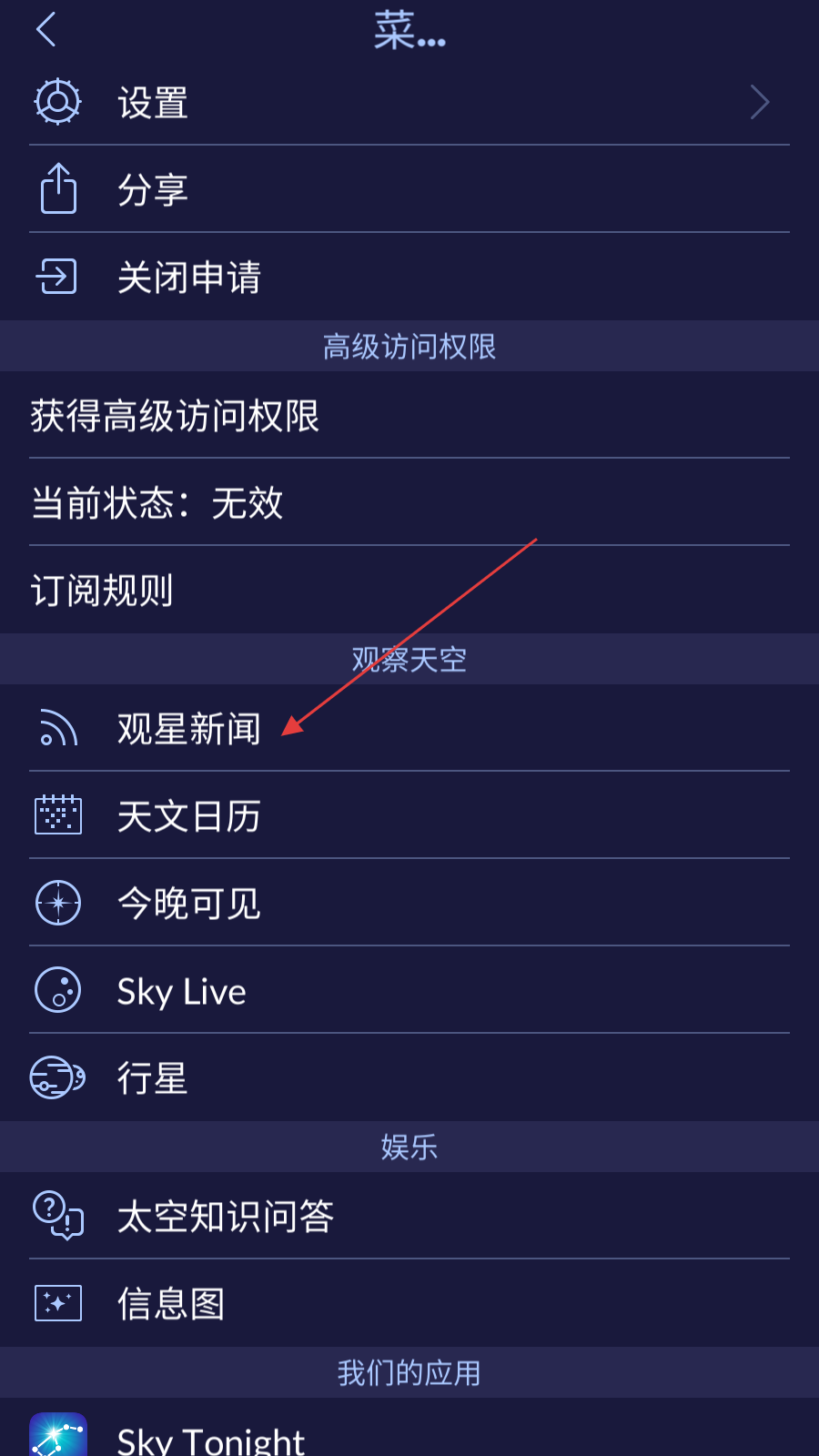 1、打开Star Walk应用,在主界面右下角找到由三条横线组成的菜单按钮并点击,进入功能菜单页面 。