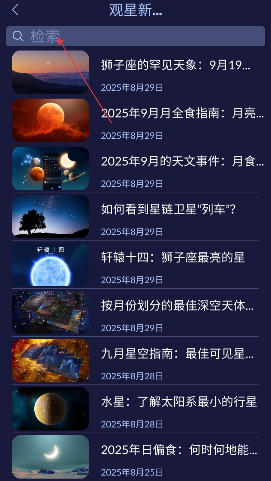 3、在观星新闻页面,可直接浏览列表中的天文资讯,也可点击顶部搜索栏,输入关键词检索特定观星新闻。