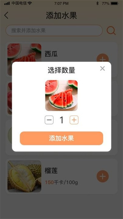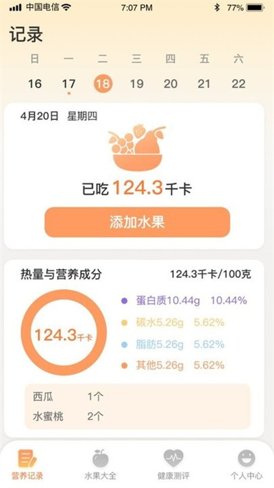 3、软件上面包含了各种水果的数据,还有事物的热量,可以根据自己的选择进行记录。