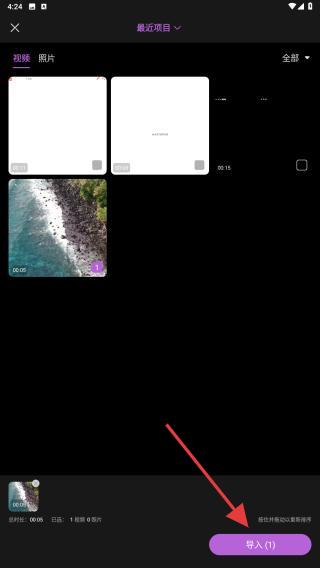 2、在素材列表中勾选需要剪辑画面的视频,点击右下角导入,进入视频编辑界面。