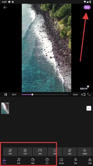 3、进入编辑页后,底部工具栏找到合适的工具进行剪辑,剪辑后点击导出即可。