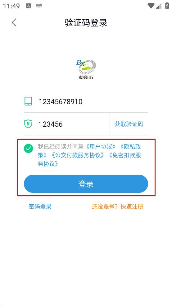 4、勾选“我已经阅读并同意用户协议,隐私政策,公交付款服务协议,免密扣款服务协议,然后点击“登录”按钮,完成登录操作。