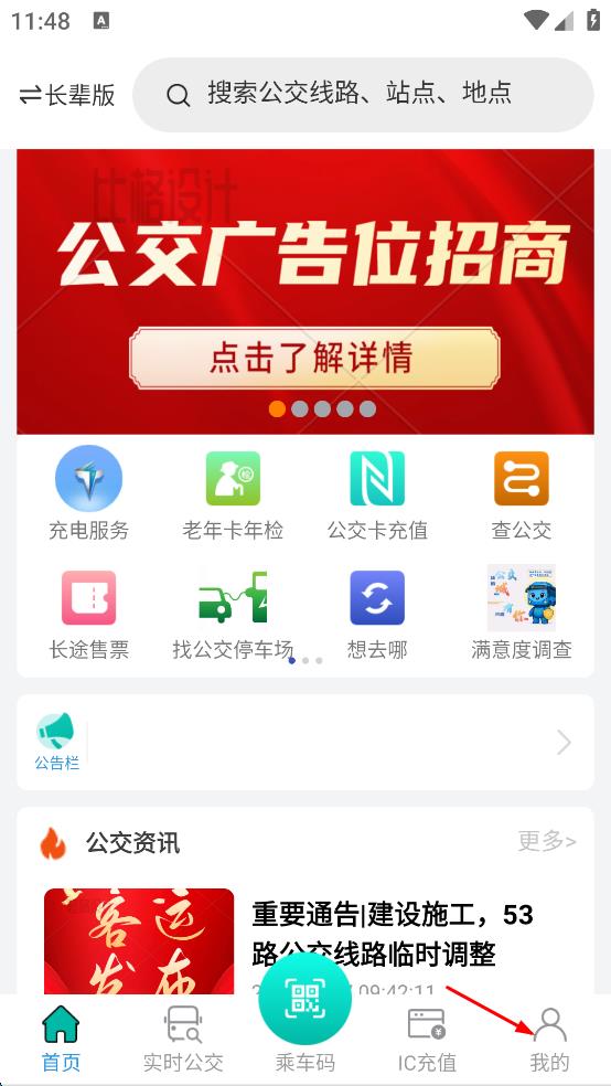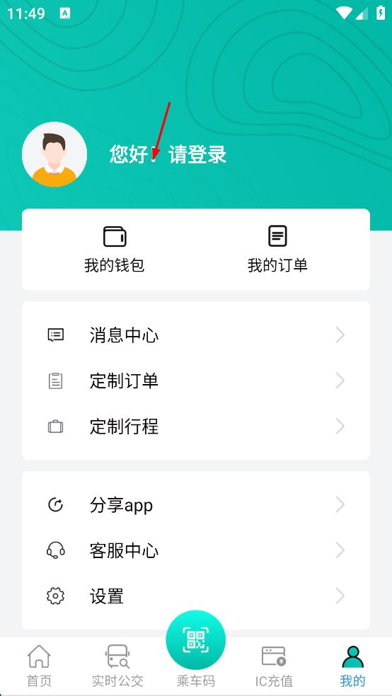 1、打开公交出行软件,点击页面底部最右侧“我的”选项,进入个人页面。