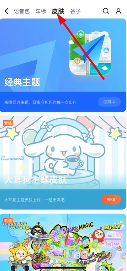 3、进入语音包页面后,点击上方的皮肤选项,选择喜欢的皮肤并应用即可。