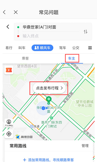 3、点击后在上方会出现一个界面,找到如图所示的【顺风车】并点击,接着点击下方的【车主】,再点击地图中的【点击发布行程】。