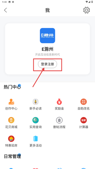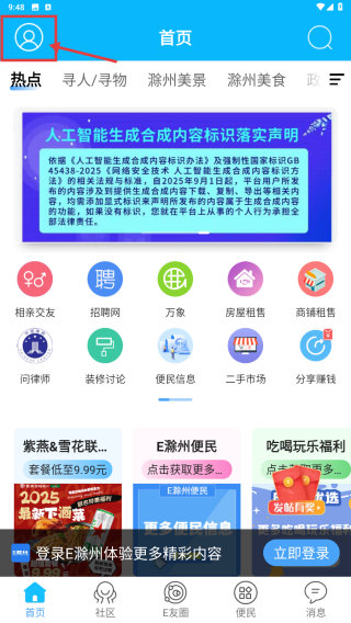 1、打开E滁州APP,点击首页左上角头像图标,进入个人中心页面。