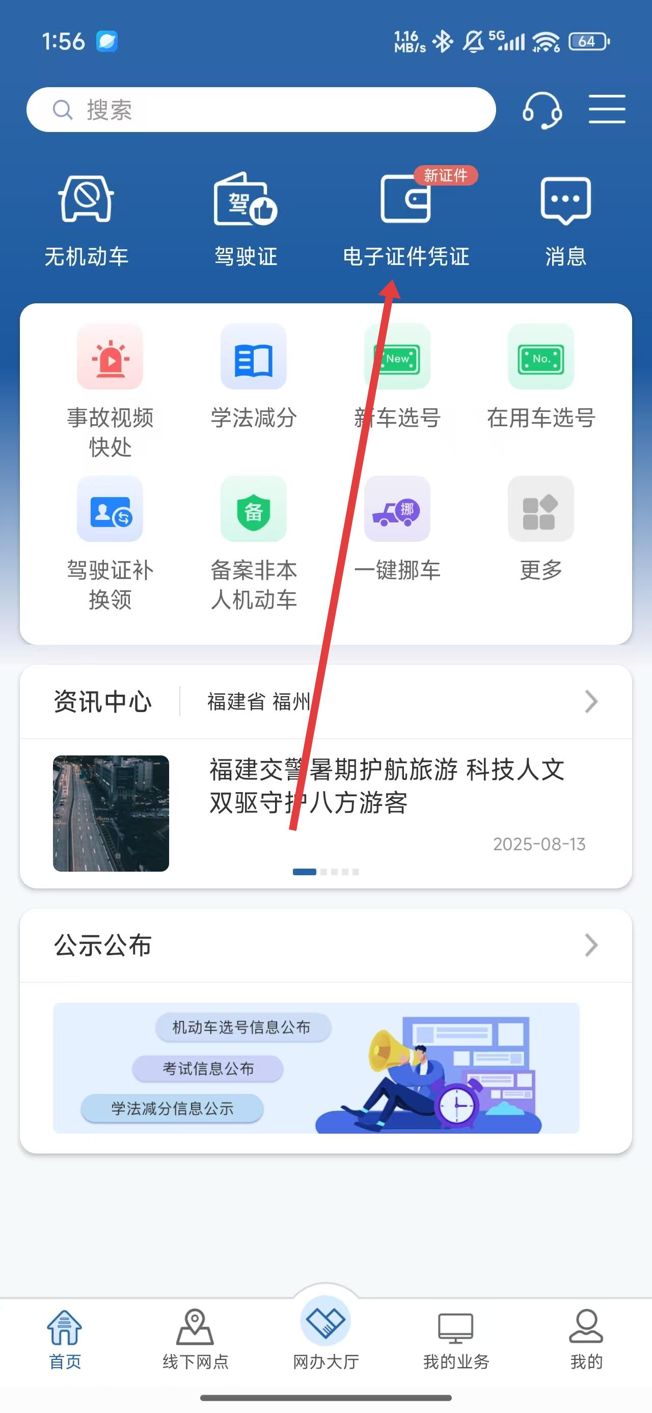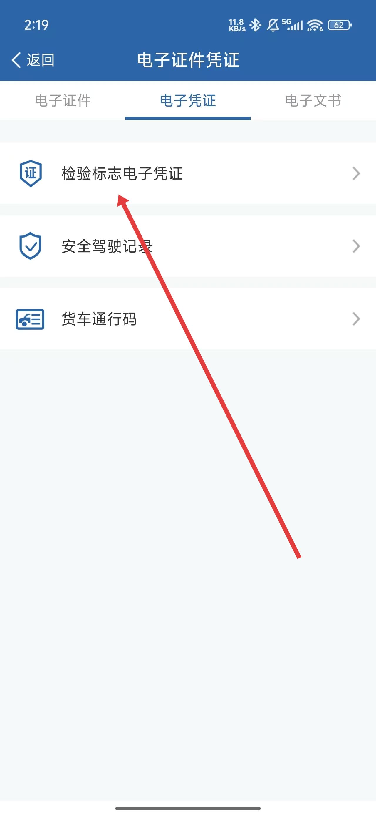 1、在交管12123主要面中,可点击电子证件凭证进入查看相关服务。
