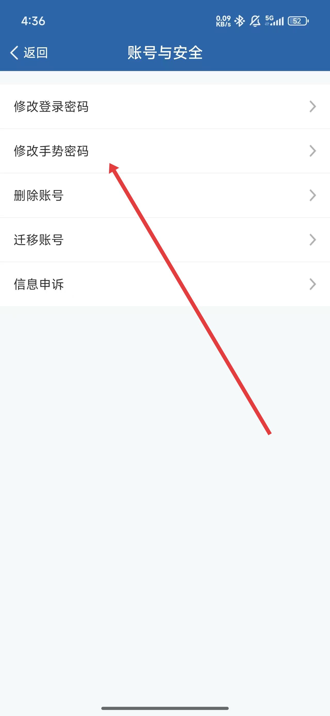 2、在跳转到账号与安全页面中后,点击修好手势密码选项,进入修改。